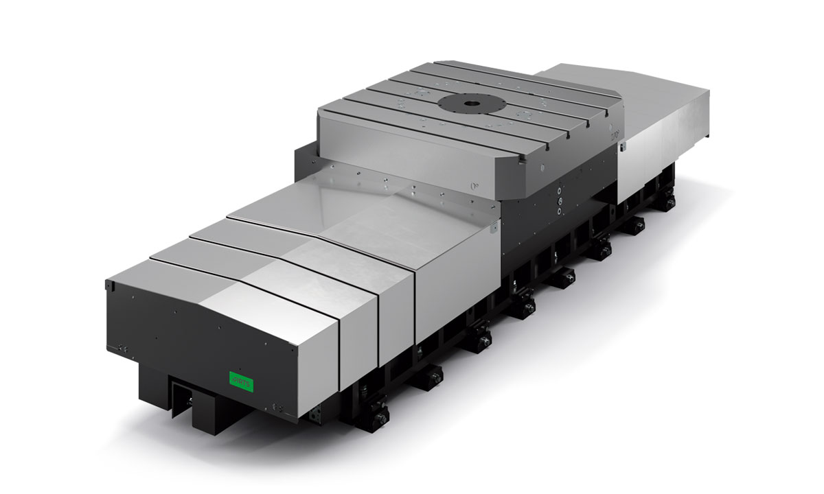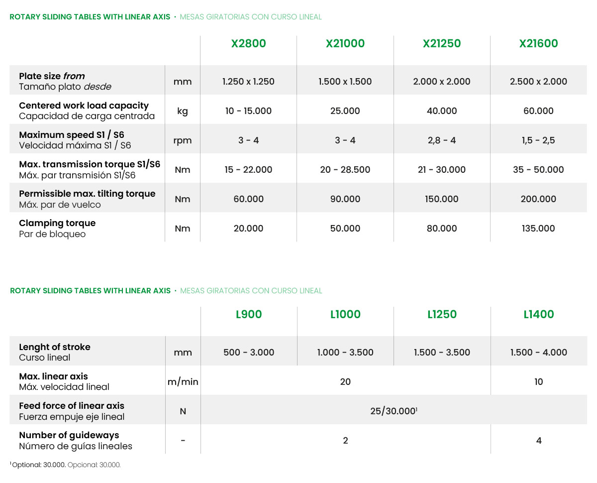 Mesas giratorias de gran capacidad con sistema de transmisión maestro-esclavo (corona y dos piñones) y ajuste holgura electrónica en combinación con movimiento lineal mediante husillo a bolas precargado y rectificado y guías lineales de rodillos. Disponibilidad de configuraciónes adaptables a las necesidades del cliente. Aplicación: fresado.